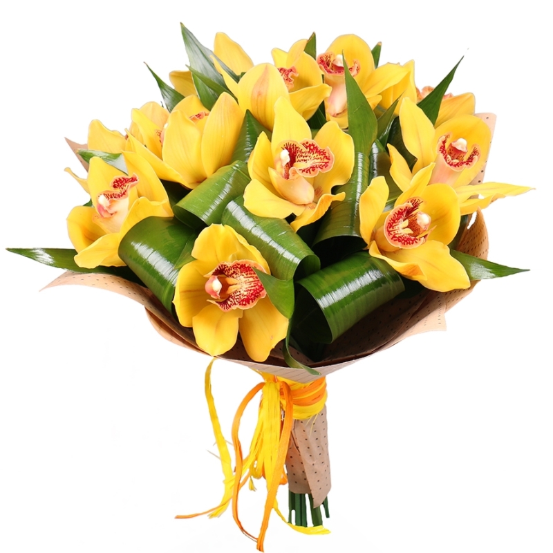 Букет состоит из 11 желтых орхидей, аспидистра, крафт, атласная лента.